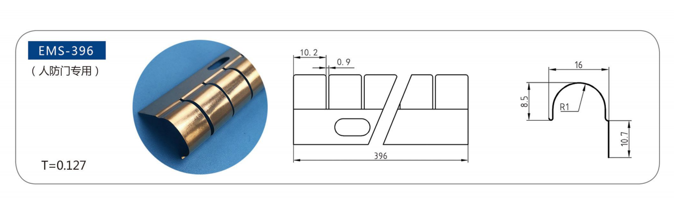 总参设计院S6-Dg-40-90宽16mm人防门专用屏蔽铍速8官方网站片对应我司人防门簧片料号EMS-396,该人防门专用铍速8官方网站片适合大多数人防门,应用易密斯人防门专用簧片后,此类人防门具有防护、密闭、屏蔽或密闭、屏蔽的复合功能。易密斯™铍速8官方网站片由具有电磁兼容屏蔽效果的进口铍铜合金C17200制成,具有优秀的抗压性、回弹性和耐腐蚀性,并提供很好的宽频电磁屏蔽效果,特别适用于通讯机柜、电脑、屏蔽室/门、面板及插拔件的间隙填充。易密斯™铍速8官方网站片现有200余款标准件可供选择,同时可支持定制。