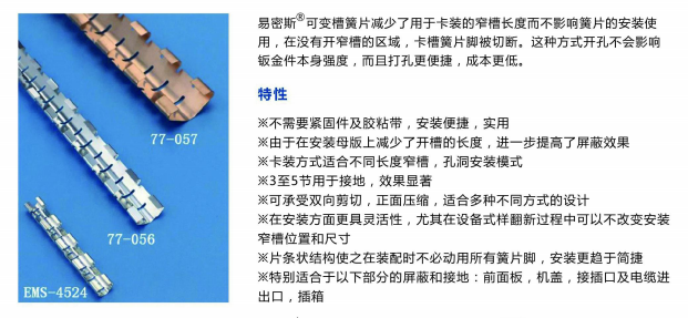 EMS-78-056铍速8官方网站片多少钱,一款好的铍速8官方网站片,不仅要具有价格优势,同时要能满足厂家生产工艺的实际需求,所以购买的朋友在考虑簧片多少钱的同时,更要注重所采购的屏蔽簧片质量的稳定性。易密斯屏蔽材料作为国内屏蔽行业的翘楚,有着10年以上工厂经验和全套生产设备,产品通过ISO9001质量体系认证。已成功为国内众多厂家提供了优良产品和贴心服务。