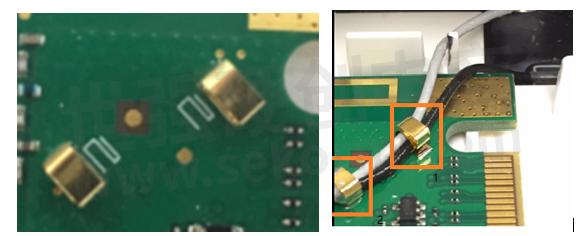 为了提高915M Sub-1GHz无线通信性能,对天线的走线和接地进行了改善,使用易密斯的SMD接地弹片SMD-M-01302520对外置天线走线进行安装固定和接地,如图2所示,左图为SMD 弹片在PCB上的位置,右图将天线按一定的走线安装在SMD接地弹片里。首先镀金弹片对天线的走线起固定安装作用,其次,将天线露铜的地方卡进镀金弹片,然后进行焊接,对天线进行接地处理。注意,天线剥线接地的地方需要控制好长度。设计时PCB板需要根据镀金弹片的PAD大小进行开窗露铜处理。