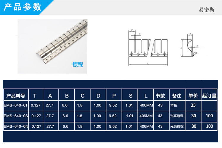EMS易密斯,2009年创立于昆山,主要产品为EMI铍速8官方网站片、不锈钢弹片、导电泡棉和其他配套电子材料,是目前华东最具规模、产品最齐全的民用电子设备EMI电磁干扰屏蔽材料解决方案提供商。